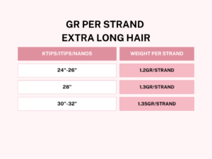 Ktips/Itips/Nanos hair’s price is shown by piece/strand, Refer to the table for gr per piece/strand. Minimum order is 25 pcs/strands.